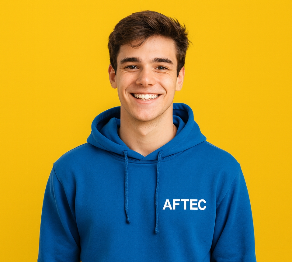 jeune étudiant de 18 ans portant un sweat à capuche bleu avec le logo AFTEC sur un fond jaune