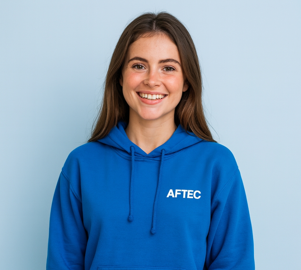 jeune femme de 20 ans portant un sweat bleu à capuche avec le logo AFTEC sur un fond bleu