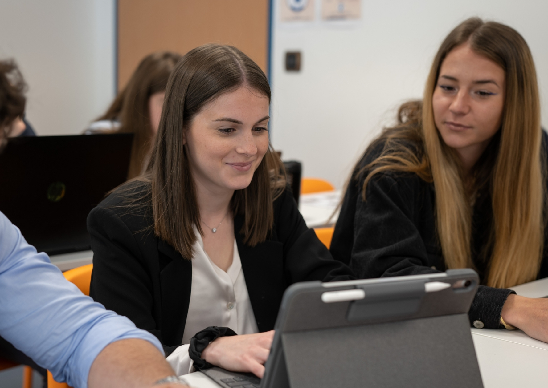 Deux jeunes femmes dans une salle de cours regardent une tablette, elles sont assisent à une table.