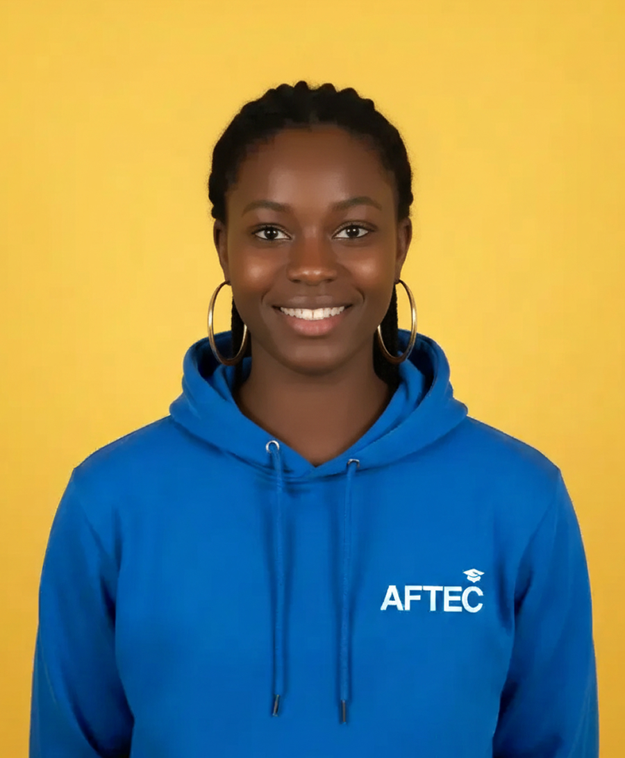 trois jeunes devant un écran et souriant. celui de gauche et l'étudiante de droite portent tous les deux un sweat AFTEC bleu. l'étudiant du milieu porte un t-shirt noir basique. les deux jeunes à gauche ont la peau blanche et la jeune à droite à la peau de couleur noir