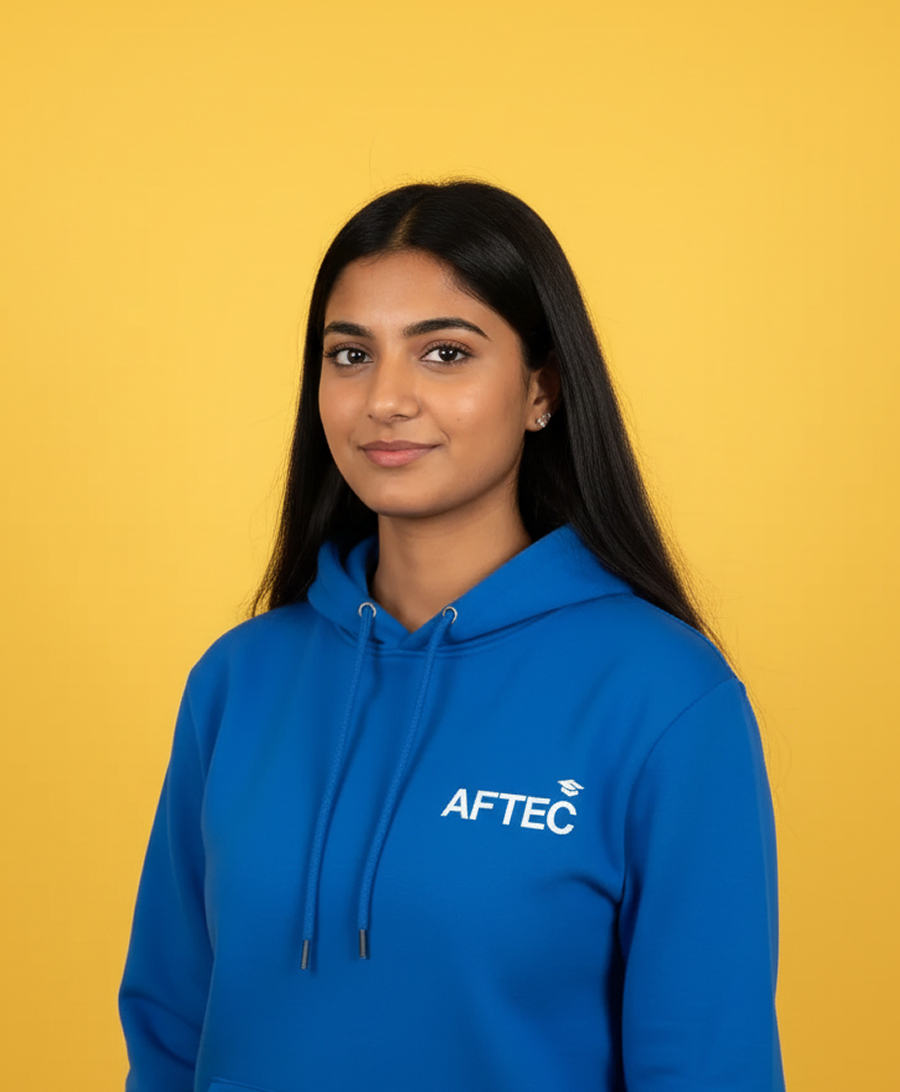 trois jeunes devant un écran et souriant. celui de gauche et l'étudiante de droite portent tous les deux un sweat AFTEC bleu. l'étudiant du milieu porte un t-shirt noir basique. les deux jeunes à gauche ont la peau blanche et la jeune à droite à la peau de couleur noir