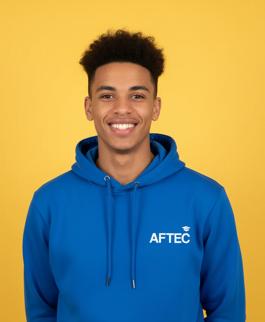 trois jeunes devant un écran et souriant. celui de gauche et l'étudiante de droite portent tous les deux un sweat AFTEC bleu. l'étudiant du milieu porte un t-shirt noir basique. les deux jeunes à gauche ont la peau blanche et la jeune à droite à la peau de couleur noir