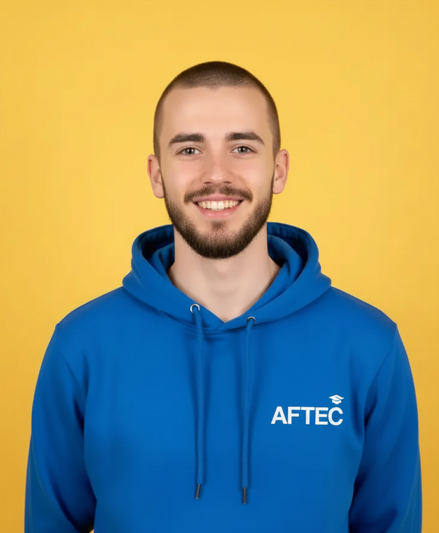 trois jeunes devant un écran et souriant. celui de gauche et l'étudiante de droite portent tous les deux un sweat AFTEC bleu. l'étudiant du milieu porte un t-shirt noir basique. les deux jeunes à gauche ont la peau blanche et la jeune à droite à la peau de couleur noir