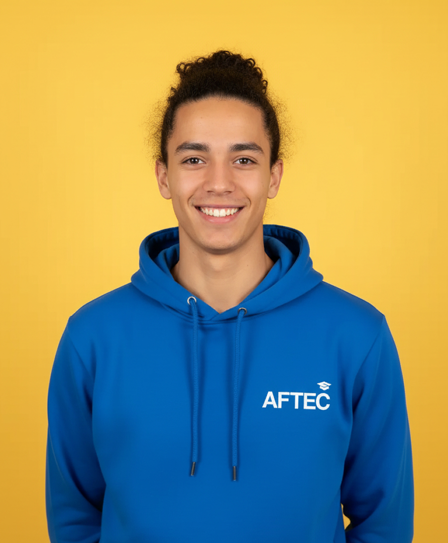 trois jeunes devant un écran et souriant. celui de gauche et l'étudiante de droite portent tous les deux un sweat AFTEC bleu. l'étudiant du milieu porte un t-shirt noir basique. les deux jeunes à gauche ont la peau blanche et la jeune à droite à la peau de couleur noir