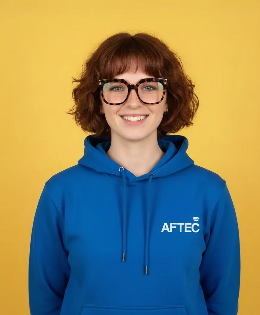 trois jeunes devant un écran et souriant. celui de gauche et l'étudiante de droite portent tous les deux un sweat AFTEC bleu. l'étudiant du milieu porte un t-shirt noir basique. les deux jeunes à gauche ont la peau blanche et la jeune à droite à la peau de couleur noir